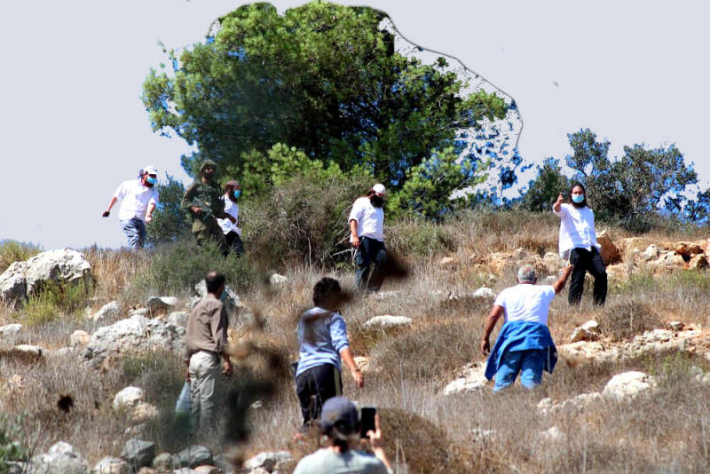 Israelische Siedler, begleitet von Soldaten, werfen Steine auf Palästinenser und Aktivisten während der Olivenernte, Huwwara, Westjordanland, 7. Oktober 2020. (Heather Sharona Weiss/Activestills.org)