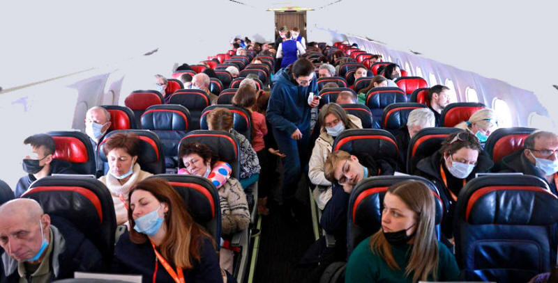 Jüdische ukrainische Flüchtlinge in einem Flugzeug, das am Donnerstag vom Flughafen Kischinjow in der moldawischen Hauptstadt nach Israel unterwegs ist.