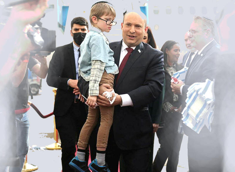 Premierminister Naftali Bennett begrüßt im März Migranten, die vor dem Krieg in der Ukraine fliehen, am internationalen Flughafen Ben Gurion in Israel.