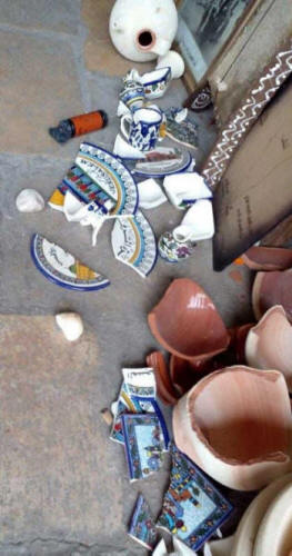 Am nächsten Tag, gegen 10:30 Uhr, holte ich Waren aus dem Geschäft und begann, sie vor dem Laden aufzustellen. Plötzlich fingen die Siedler an, Steine auf den Laden und auf Passanten zu werfen. Sie warfen eine Menge Steine, und einige davon trafen meine Waren. Alle Antiquitäten und Arabesken, die draußen standen, wurden zertrümmert. Als wir nachsahen, woher die Steine kamen, sahen wir mehr als 20 Siedler auf den Dächern von Beit Romano stehen und Steine werfen. Wir suchten nach dem Soldaten, der an den beiden Beobachtungspunkten stationiert ist, aber er war nicht da. Wir sahen auch keine Soldaten in der Gegend.