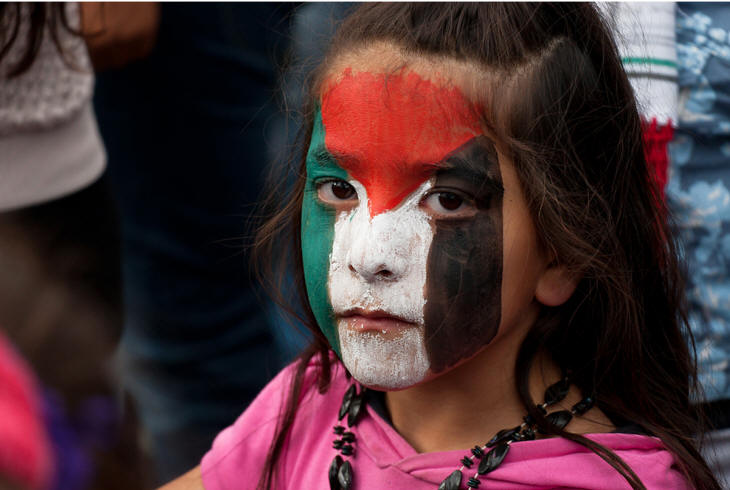 Image description: The feature image shows a child with the Palestinian flag painted on her face at a protest in Berlin. Image used with permission by Montecruz Photo via Flickr. The in-text image shows the separation wall that separates Israel from the West Bank. The picture is taken from the ground and shows a high concrete wall. There is rubble on the ground. Image used with permission by Justin McIntosh via Wikimedia Commons.