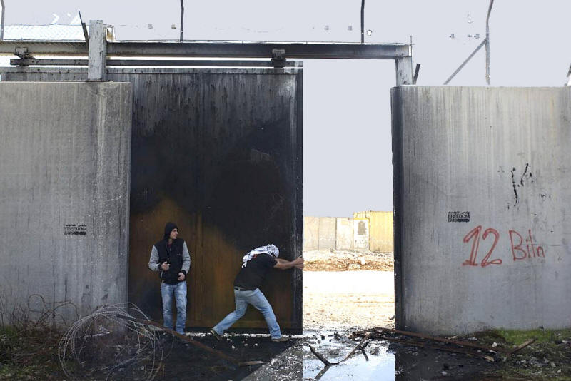 Palästinensische Jugendliche öffnen ein Tor der Trennungsmauer während einer Demonstration zum 12-jährigen Bestehen des Kampfes gegen die Besatzung im Westjordanlanddorf Bil'in, 17. Februar 2017. (Oren Ziv)