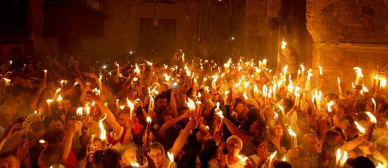 Am ernsten Ende der Osterskala habe ich in Ramallah das "Bringen des Feuers" gesehen, eine Ostertradition in den Kirchen Palästinas. Am Karsamstag, dem Tag vor dem orthodoxen Osterfest, betritt der griechisch-orthodoxe Patriarch von Jerusalem das Grab des Heiligen Grabes. Nach einem Moment des Gebets tritt er mit dem Heiligen Feuer hervor, das jedes Jahr vom Grab Christi ausgeht. Dieses wird per Kerze an die versammelten Gläubigen weitergegeben und erleuchtet spontan wie von Geisterhand die ganze Kirche.