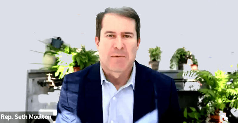 Repräsentant Seth Moulton (D-Mass) im Webinar mit J Street am 22. März 2022, bei dem er seinen Besuch in Israel und Palästina mit der Gruppe im Februar 2022 diskutiert. Screenshot von Zoom.