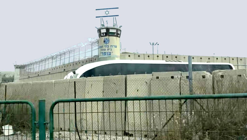 Das Militärgericht und Gefängnis von Ofer, das auf enteignetem Land des Dorfes Beitunia, 4 km von Ramallah entfernt, gebaut wurde. Das Foto wurde vom Autor am 12. Dezember 2021 vor einer Militärgerichtssitzung zum Prozess gegen die Direktorin des Health Work Committees, Shatha Odeh, aufgenommen. (Foto: Ayah Kutmah)