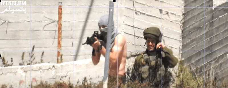 Ein Bild von B'Tselem vom 14. Mai 2021 zeigt einen maskierten Siedler in Militärhose, der in das palästinensische Dorf 'Urif im besetzten Westjordanland eindringt und auf Palästinenser schießt, während ein israelischer Soldat zusieht. Bildschirmfoto.