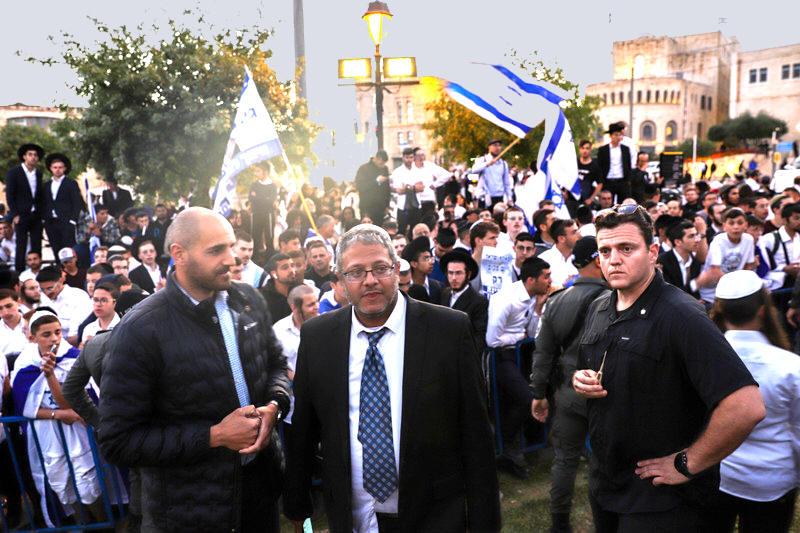 Drei Männer stehen vorne, während andere hinter ihnen Fahnen schwenken - Der israelische Rechtsextremist Itamar Ben-Gvir nimmt am 20. April 2022 an einem von israelischen jüdischen Rassisten organisierten Marsch in Jerusalem teil. - Jeries Bssier