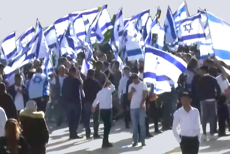 Tausende von Israelis nehmen an dem jährlichen Fahnenmarsch teil, der durch West- und Ostjerusalem zum Damaskustor führt, wo sie tanzen, israelische Nationallieder singen und antipalästinensische und arabische Slogans skandieren. Letztes Jahr skandierten sie: "Tod den Arabern und Palästinensern".