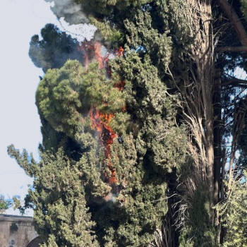 Palästinensischen Berichten zufolge geriet ein Baum im Innenhof der al-Aqsa-Moschee durch israelisches Tränengas in Brand.