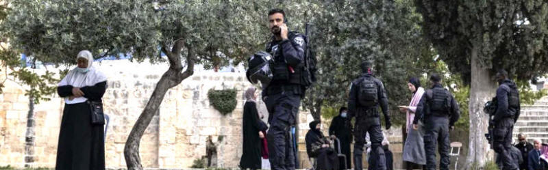 Israel griff die Gläubigen unter dem Vorwand an, das jüdische Pessachfest zu feiern und die Al Aqsa zu betreten. (Es bleibt eine unbegründete Behauptung, dass sich der Tempel Salomos unter der Al-Aqsa-Moschee befindet). WAFA, die palästinensische Nachrichten- und Informationsagentur, berichtet heute: "Den fünften Tag in Folge stürmte die israelische Polizei heute Morgen die Al-Aqsa-Moschee, eine der heiligsten Stätten des Islams im besetzten Ost-Jerusalem, um die provozierende Anwesenheit jüdischer fanatischer Gruppen auf dem heiligen Gelände zu sichern. Nach Angaben von Zeugen.... setzte die Polizei Gewalt und Feuerwaffen ein, um die Höfe des Moscheegeländes von den palästinensischen Gläubigen zu räumen, was zu mehreren Verletzungen durch Schläge und Erstickung durch das von der Polizei abgefeuerte Tränengas führte. Muslimische Männer und Frauen wurden gezwungen, in die Gebäude des Geländes zu gehen und dort zu bleiben, bis die jüdischen Gruppen einige Stunden später ihre Führungen beendet hatten. Während des jüdischen Pessach-Festes, das am Samstag zu Ende geht, hat die Polizei einer großen Anzahl von Juden erlaubt, das Gelände der Al-Aqsa-Moschee zu stürmen, was zu ernsthaften Reibereien mit den palästinensischen Gläubigen geführt hat, die oft gewalttätig wurden".