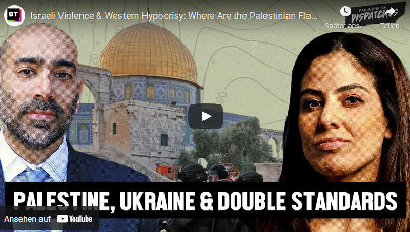 Ein Jahr nachdem zionistische Extremisten in Jerusalem eine trotzige Reaktion der Palästinenser im besetzten Gazastreifen provoziert haben, wiederholt sich nun dasselbe Szenario. Israelis greifen während des Ramadan palästinensische Gläubige in der Al-Aqsa-Moschee an, exekutieren Palästinenser im besetzten Westjordanland und bombardieren erneut den Gazastreifen, ohne dass der Westen sein Mitgefühl für die ukrainischen Opfer bekundet oder die Aggressoren verurteilt. Tatsächlich sind es genau die Nationen, die die Ukrainer am eifrigsten unterstützen, die auch die israelischen Unterdrücker der Palästinenser unterstützen. Um die jüngste israelische Eskalation zu kontextualisieren und die Doppelmoral zu entlarven, wurde Rania Khalek von Ali Abunimah, dem Geschäftsführer der Electronic Intifada und Autor von "The Battle for Justice in Palestine" (Der Kampf um Gerechtigkeit in Palästina), begleitet.