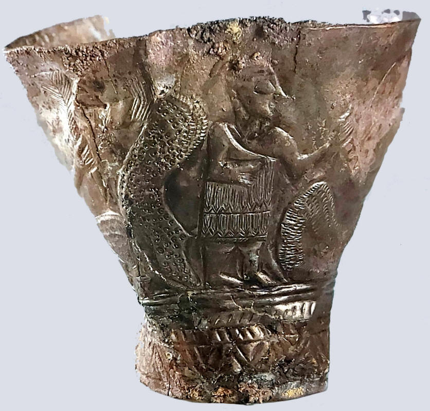 Ein Kelch aus Silber, dessen Reliefdekoration eine mythische Szene aus Palästina widerspiegelt