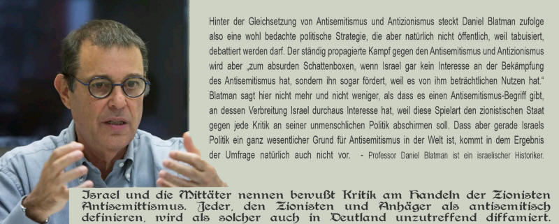 Hinter der Gleichsetzung von Antisemitismus und Antizionismus steckt Blatman zufolge also eine wohl bedachte politische Strategie, die aber natürlich nicht öffentlich, weil tabuisiert, debattiert werden darf. Der ständig propagierte Kampf gegen den Antisemitismus und Antizionismus wird aber „zum absurden Schattenboxen, wenn Israel gar kein Interesse an der Bekämpfung des Antisemitismus hat, sondern ihn sogar fördert, weil es von ihm beträchtlichen Nutzen hat.“ Blatman sagt hier nicht mehr und nicht weniger, als dass es einen Antisemitismus-Begriff gibt, an dessen Verbreitung Israel durchaus Interesse hat, weil diese Spielart den zionistischen Staat gegen jede Kritik an seiner unmenschlichen Politik abschirmen soll. Dass aber gerade Israels Politik ein ganz wesentlicher Grund für Antisemitismus in der Welt ist, kommt in dem Ergebnis der Umfrage natürlich auch nicht vor.