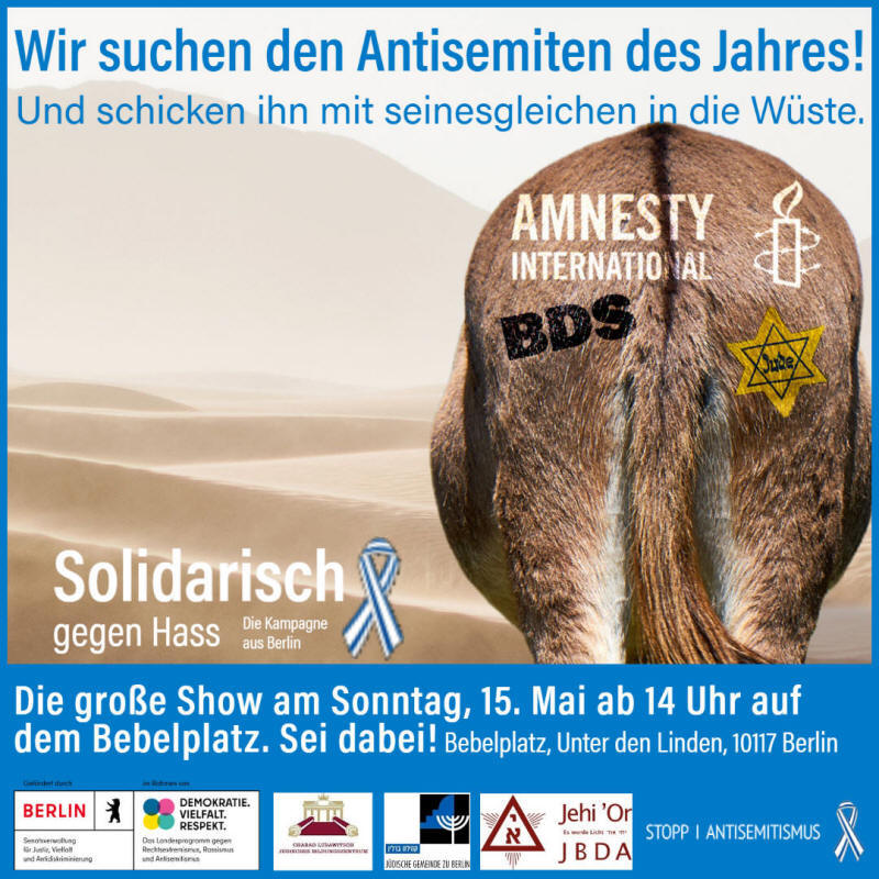 Am Jahrestag der Nakba, Sonntag, den 15. Mai, veranstalten offizielle Berliner Institutionen eine "Auszeichnung" für den Antisemiten des Jahres, und auf dem Plakat steht Amnesty International, die wohl maßgebliche und weltweit anerkannte Organisation für die Verteidigung der Menschenrechte, schuldig, ein 278 Seiten umfassendes Dossier veröffentlicht zu haben, das auf jahrelangen Recherchen in diesem Bereich beruht, in Synergie mit anderen auf dem Gebiet der Menschenrechte tätigen Realitäten, das auf unwiderlegbare Weise erklärt (wenn es noch nötig wäre), warum Israel nicht "die einzige Demokratie im Nahen Osten" ist, sondern eine Apartheid, die die Palästinenser seit 74 Jahren unterdrückt.