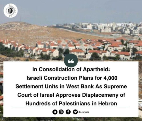 Das Palästinensische Zentrum für Menschenrechte verurteilt die israelische Entscheidung, Tausende von Siedlungseinheiten in der Westbank zu bauen. Diese Ankündigung fiel mit dem Urteil des israelischen Obersten Gerichtshof zusammen, in dem die Vertreibung von Hunderten von Palästinensern von ihren Ländereien in Hebron bewilligt wird, um das Apartheidregime, das Israel den besetzten palästinensischen Gebieten (oPt) auferlegt hat, unter dem Schweigen der internationalen Gemeinschaft zu stärken.