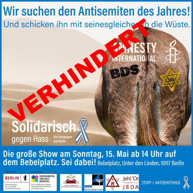 Mit der angekündigten „großen Show“ auf dem Bebelplatz in Mitte wollte die Kampagne den „Antisemiten des Jahres“ finden und „in die Wüste“ schicken. Auf ihrem in sozialen Netzwerken geposteten Flyer ist ein Esel zu sehen, der gemächlich Richtung Wüste trabt. Auf seinem Hintern prangen ein Judenstern, das Kürzel der umstrittenen BDS-Kampagne – und das Logo von Amnesty International. mehr >>> |