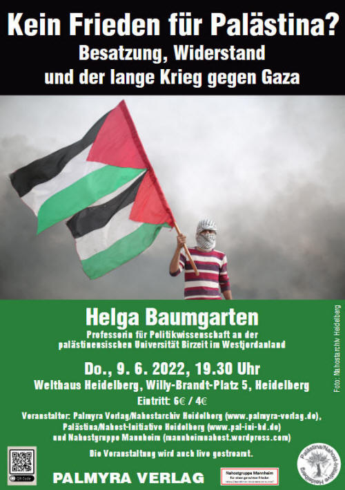 Vor diesem Hintergrund und nach zwei Jahren Corona veranstaltet der Palmyra Verlag zusammen mit der Palästina/Nahost-Initiative Heidelberg und der Nahostgruppe Mannheim am 9. Juni um 19:30 Uhr einen Vortrag mit Helga Baumgarten im Welthaus Heidelberg.