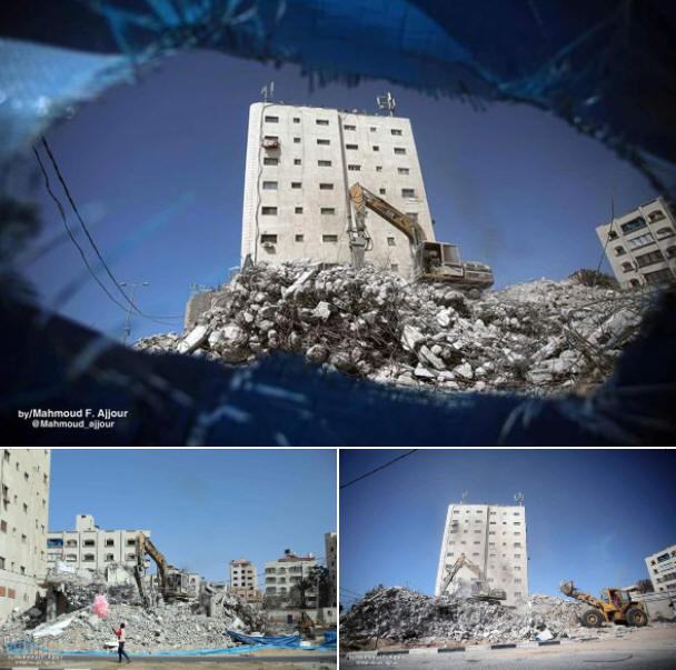 Verfolgt - In den folgenden Tagen wurden die Bombardierungen intensiviert. Israel zerstörte mehrere Türme, darunter den al-Jawhara-Turm, den Hanadi-Turm und den al-Shorouq-Turm. In den meisten dieser Gebäude befanden sich Medienbüros, Gewerbebetriebe, Geschäfte und Wohnungen. Die Bombardierung des al-Jawhara-Turms führte dazu, dass die Hauptinternetleitung in unserem Haus und in unserer Nachbarschaft einen ganzen Monat lang unterbrochen war.