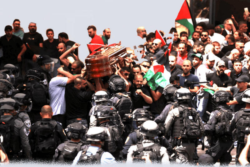 Dieser "starke" Staat versuchte, die Zahl der Trauernden, die an Shireens Beerdigung teilnahmen, zu begrenzen, und plante, diese Anordnung umzusetzen, indem er verlangte, dass sich die Beerdigung auf religiöse Riten beschränkte und dass die Trauernden keine palästinensischen Flaggen hissen sollten, und er setzte daher Polizeikräfte in der Nähe des (St. Louis) French Hospital ein, um seine Kontrolle über die Beerdigung zu verschärfen.