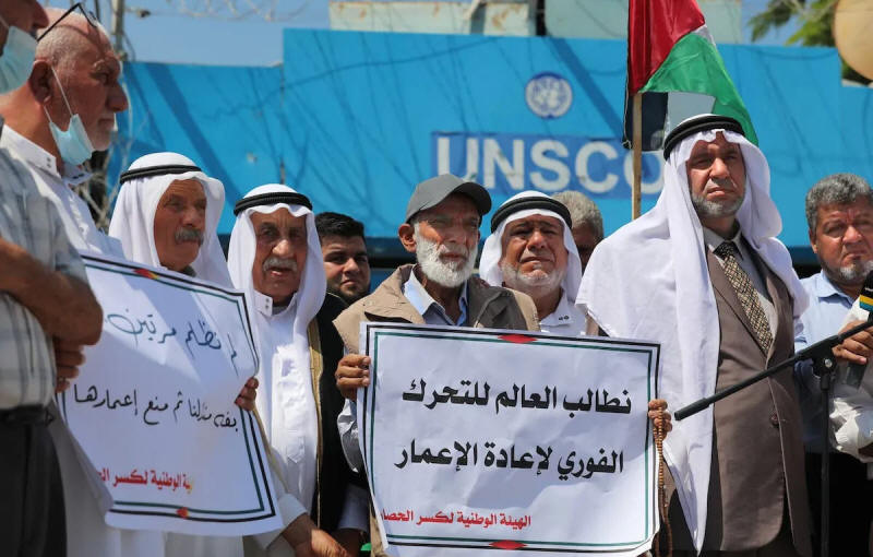 Bewohner des Gazastreifens protestieren vor dem Gebäude des Sonderkoordinators der Vereinten Nationen für den Friedensprozess im Nahen Osten (UNSCO) gegen die israelische Blockade in Gaza-Stadt am 11. Juli 2021 und fordern den Wiederaufbau der bei den jüngsten Angriffen zerstörten Häuser. (Mustafa Hassona - Anadolu Agency)