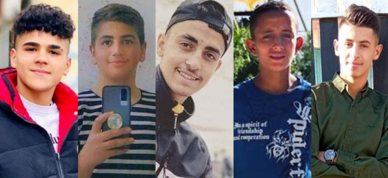 Bildcollage von fünf Jungen - Von links nach rechts: Ghaith Yamin, 16, Zaid Ghunaim, 14, Thaer Maslat, 16, Amjad Fayed, 16, Mutasem Atallah, 17. Verteidigung für Kinder International - Palästina