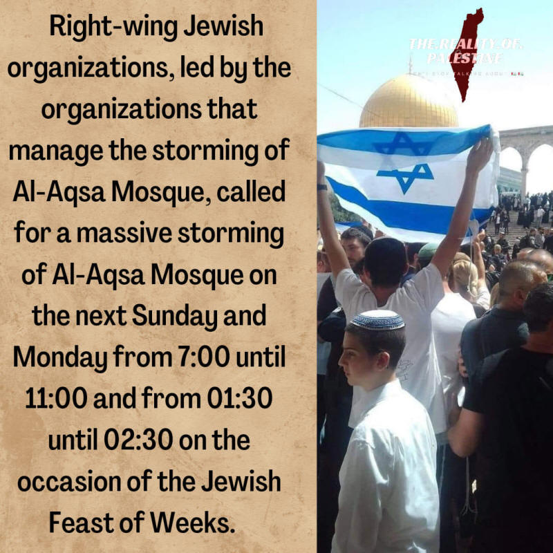 Rechtsgerichtete jüdische Organisationen, angeführt von den Organisationen, die die Erstürmung der Al-Aqsa-Moschee organisieren, riefen für den kommenden Sonntag und Montag von 7:00 bis 11:00 Uhr und von 01:30 bis 02:30 Uhr zu einer massiven Erstürmung der Al-Aqsa-Moschee auf.