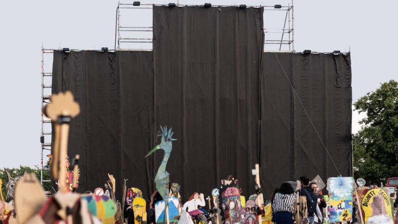 Die Ausstellung von People’s Justice auf dem Friedrichsplatz ist die erste Präsentation des Banners in einem europäischen und deutschen Kontext. Sie steht in keiner Weise mit Antisemitismus in Verbindung. Wir sind traurig darüber, dass Details dieses Banners anders verstanden werden als ihr ursprünglicher Zweck. Wir entschuldigen uns für die in diesem Zusammenhang entstandenen Verletzungen. Als Zeichen des Respekts und mit großem Bedauern decken wir die entsprechende Arbeit ab, die in diesem speziellen Kontext in Deutschland als beleidigend empfunden wird. Das Werk wird nun zu einem Denkmal der Trauer über die Unmöglichkeit des Dialogs in diesem Moment. Wir hoffen, dass dieses Denkmal nun der Ausgangspunkt für einen neuen Dialog sein kann.“