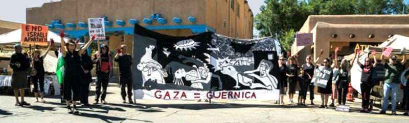 Love-In-Action Taos, CODEPINK Taos und Mitglieder der Gemeinde arbeiteten zusammen, um diese Demonstration zu organisieren. Love-In-Action-Mitglieder entwarfen das Transparent "Gaza = Guernica" und malten es letzte Woche an einem Nachmittag gemeinsam. Hunderte von Gemeindemitgliedern wurden mit dieser Demonstration erreicht; Zehntausende mehr wurden mit der "Online-Demonstration" der Fotos erreicht, die in den sozialen Medien geteilt wurden. Wir ermutigen andere, diese Demonstration in ihren eigenen Gemeinden zu wiederholen und auch unser Kunstwerk zu kopieren (ja, bitte tun Sie das.). Wenn Sie Informationen wünschen, wenden Sie sich an Love-In-Action Network. Quelle