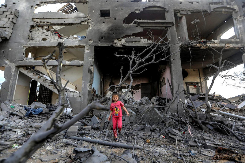 Ein palästinensisches Kind steht inmitten der Trümmer eines Gebäudes nach israelischen Luftangriffen, Beit Hanoun, Gazastreifen,