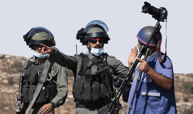 Grenzpolizisten zwingen einen palästinensischen Kameramann während der palästinensischen Olivenernte in der Nähe eines illegalen Außenpostens in der Nähe des Dorfes Burka, Westjordanland, 16. Oktober 2020, das Gebiet zu verlassen. (Oren Ziv)
