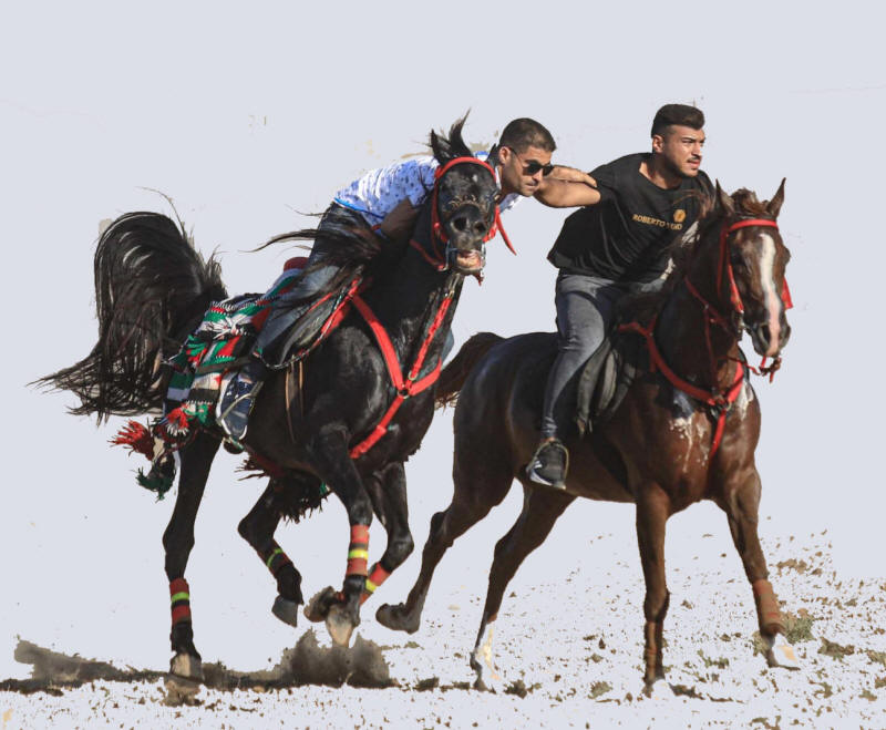 Auf einer Beduinenhochzeit am 15. Juli zeigen palästinensische Reiter ihr Können mit arabischen Pferden aus Gaza.