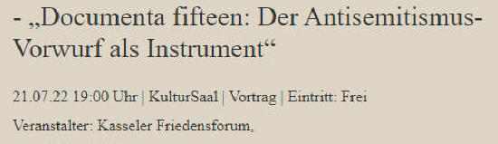 Erklärung der documenta-Künster*innen aus Anlass der Empfehlung des Aufsichtsrats der documenta vom 16.7.22, "in einen Prozess der Konsultation mit Wissenschaftlern aus dem Bereich des zeitgenössischen Antisemitismus einzutreten". pdf (Original und deutsch) im Anhang