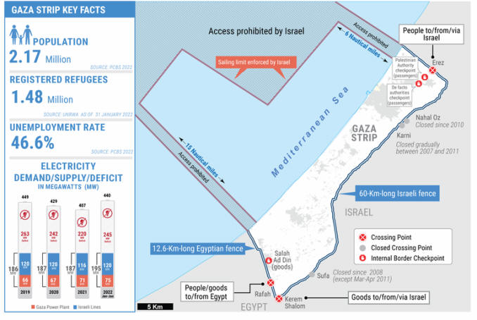 1.Circa 2,1 Millionen Palästinenser in Gaza sind „eingesperrt“, die breite Mehrheit hat keinen Zugang zum Rest der besetzten Gebiete und der Außenwelt, nur begrenzten Zugang zu medizinischer Behandlung, die in Gaza nicht verfügbar ist, zu höherer Bildung, zur Familie und zum sozialen Leben, und keine wirtschaftliche Chancen. Bewegungseinschränkungen, die von den israelischen Behörden seit den frühen 1990ern verhängt wurden und die nach der Hamas Übernahme von Juni 2007 noch verstärkt wurden, unter Berufung auf Sicherheitsgründe, hatten tiefgreifende Auswirkungen auf die Lebensbedingungen in Gaza und haben die territoriale Einheit und das wirtschaftliche und soziale Gefüge der besetzten Gebiete gespalten. Diejenigen, die für Ausreisegenehmigungen ausgewählt werden, stellen eine winzige Minderheit dar, hauptsächlich Tagesarbeiter, Geschäftsleute, Patienten und Mitarbeiter von internationalen Organisationen. Auch wenn die Isolation von Gaza durch die Wiedereröffnung des Übergangs in Rafah durch Ägypten seit 2018 bis zu einem gewissen Grad entschärft wurde, bleibt die Bewegungsfreiheit durch Rafah weiterhin eingeschränkt und die Auswahlkriterien für Reisende ungewiss.