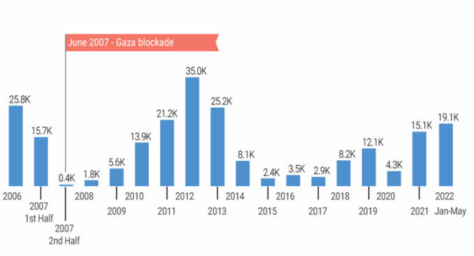 •Nach der Blockade sank die Anzahl der LKW-Ladungen an kommerziellen Gütern dramatisch, bis auf zwei Ladungen im Durchschnitt pro Monat in 2009. Nach der Eskalation der Feindseligkeiten 2014 wurden die Transfers von Gaza zur Westbank wieder aufgenommen und seit März 2015 auch die Exporte nach Israel. Im August 2021 steigerten sich die Exporte nach Ägypten zum ersten Mal durchschnittlich auf 787 in den ersten fünf Monaten von 2022. Vor der Blockade betrug das Maximum 961 (Ladungen) im Monat.