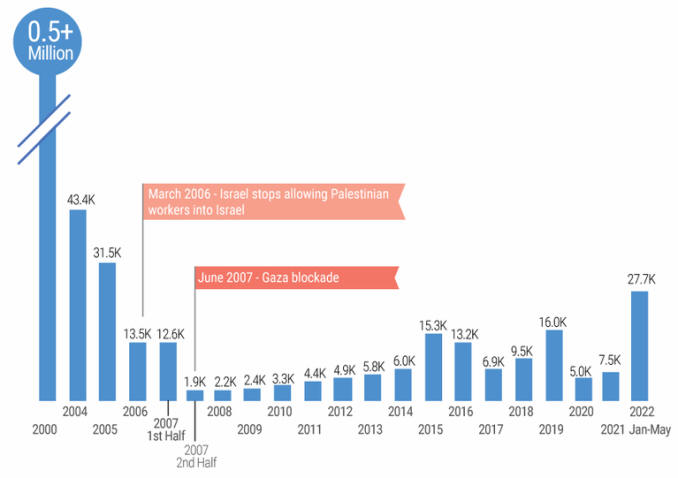 •Vor der Zweiten Intifada im Jahr 2000 wurden bis eine halbe Million Ausreisen von Menschen aus Gaza nach Israel, hauptsächtlich Arbeiternehmer, in einem einzigen Monat verzeichnet. In den ersten sieben Jahren der Blockade reduzierte sich die Anzahl auf knapp über 4000 im Durchschnitt und stieg im Laufe der folgenden acht Jahre auf 10.400 pro Monat.