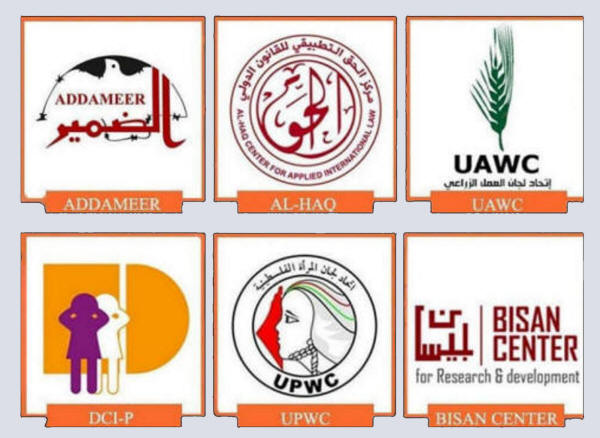 Die sechs palästinensischen Menschenrechts- und Zivilgesellschafts-Organisationen sind: Addameer, Al-Haq, Defense for Children International – Palestine, die Union of Agricultural Work Committees, das Bisan Center for Research and Development und die Union of Palestinian Women Committees.