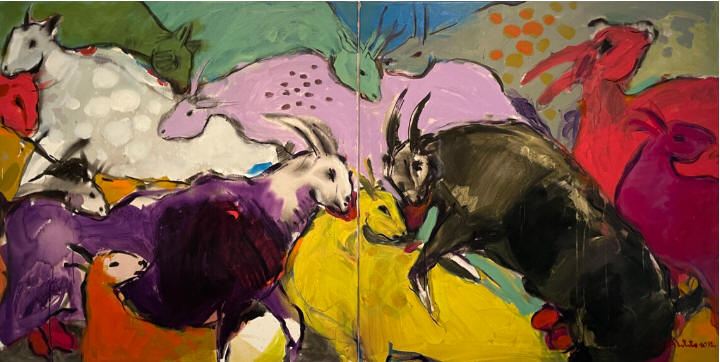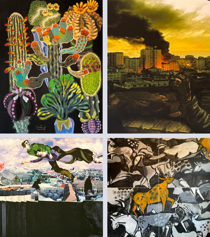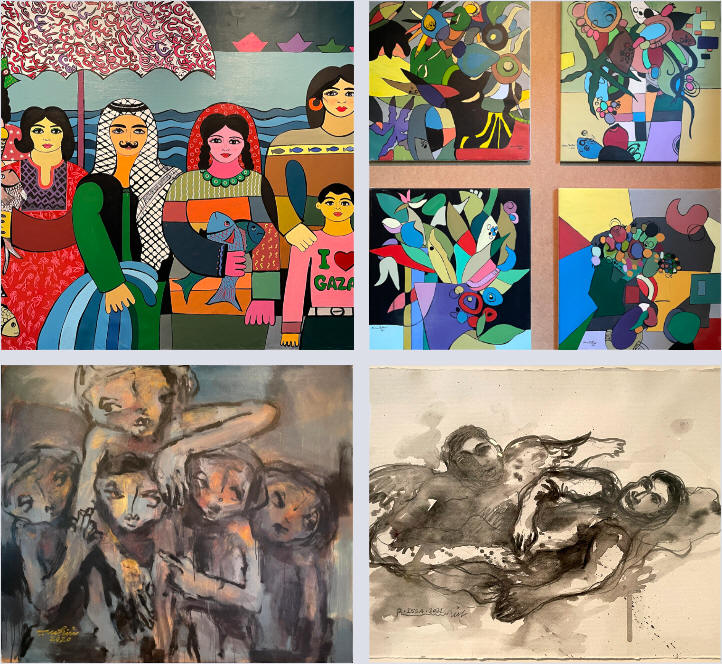 Dass manche der Bilder aus mehreren Leinwänden zusammengesetzt sind, hat einen praktischen Grund: So ließen sie sich leichter aus Gaza heraus bringen, um auf internationalen Ausstellungen präsentiert zu werden.