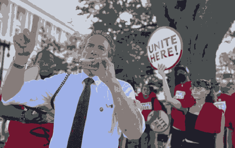 Repräsentant Andy Levin spricht auf einer UNITE HERE-Kundgebung zur Unterstützung der Beschäftigten in der Senatskantine, 20. Juli 2022. (Foto: Twitter/@Andy_Levin)