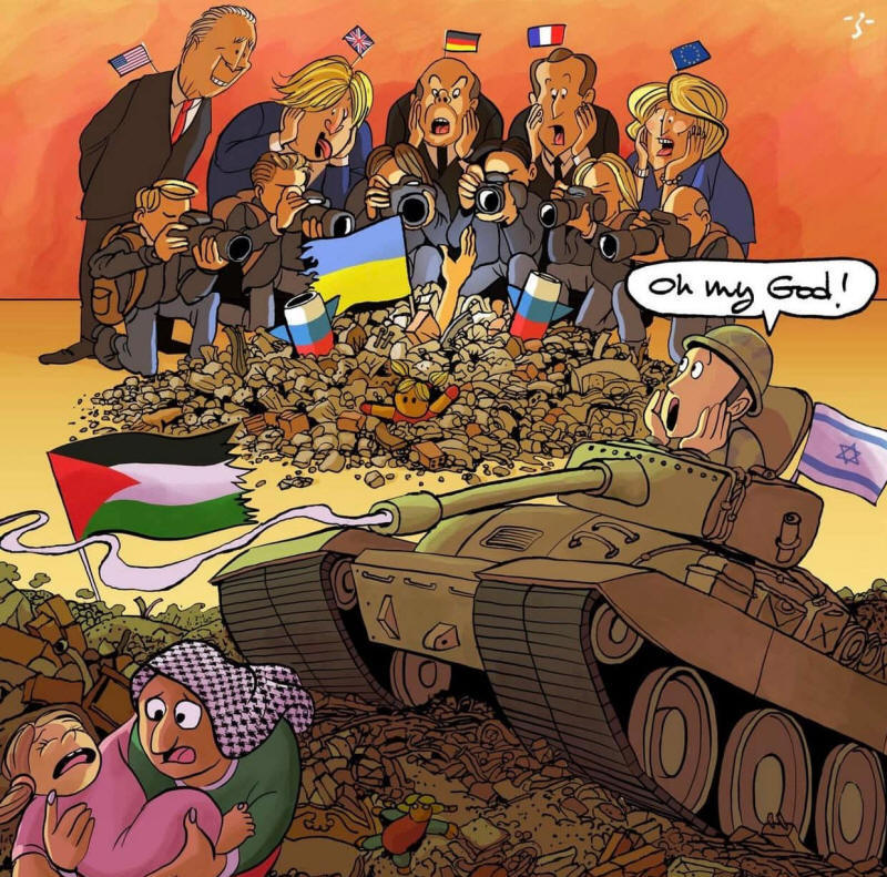 Während die Vereinigten Staaten und die europäischen Länder Waffen im Wert von Milliarden von Dollar in die Ukraine schicken und ukrainische Soldaten ausbilden, die sich angeblich gegen die Invasion und die Besetzung wehren sollen, schicken sie Israel Waffen, um ihm bei der Invasion, der Besetzung und der Kolonisierung der Palästinenser zu helfen.
