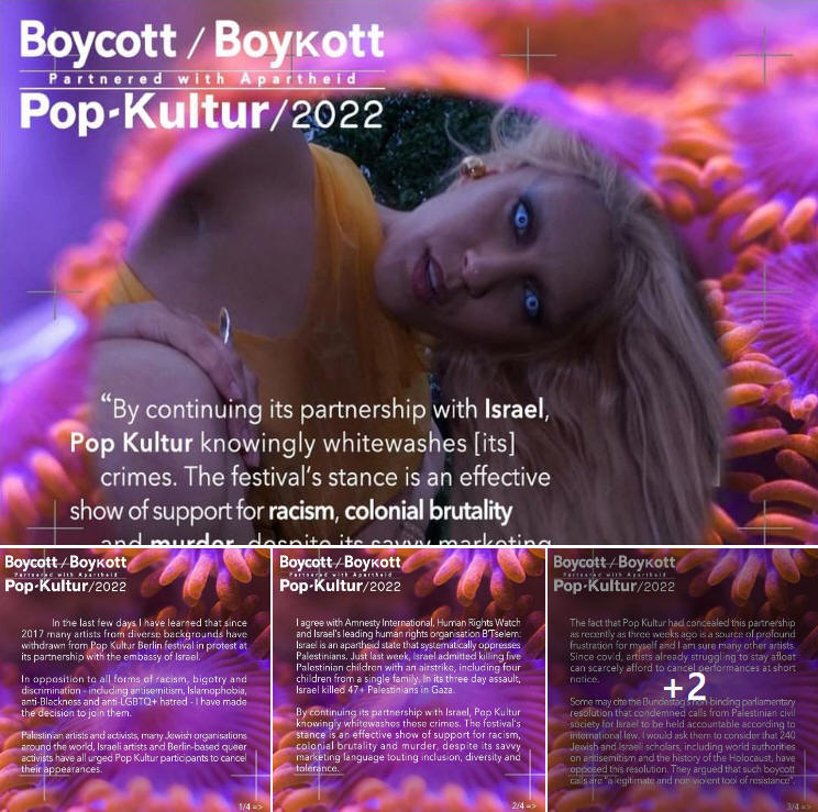 Dennoch nehmen einige Leute Anstoß am Pop-Kultur-Festival. Zu den Förderern des Festival zählt seit einigen Jahren – und so auch dieses Jahr – die israelische Botschaft. Aus Perspektive der israelkritischen BDS-Bewegung („Boycott, Divestment and Sanctions“), die und den dazu gehörenden Twitter-Kanal betreibt, mache das Festival somit gemeinsame Sache mit der Politik der israelischen Regierung, der BDS und zahlreiche zivilgesellschaftliche Organisationen inner- und außerhalb Israels „Apartheid“ gegenüber Palästinensern vorwerfen.