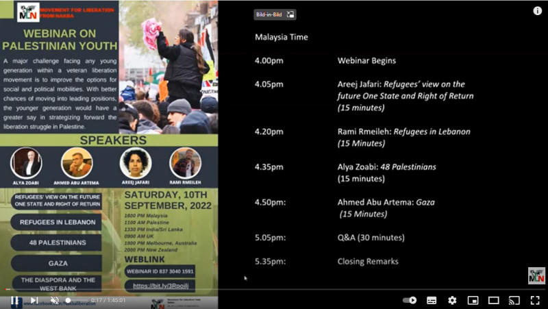 Stellungnahme - Ranjan Solomon For MLN Palestine Updates - Die palästinensische Jugend ist gut in den Kampf für die Befreiung Palästinas eingebunden. Gleichzeitig suchen sie nach einem eigenen Raum, in dem sie ihre soziale und politische Mobilität verbessern können. In einem aufschlussreichen und herausfordernden Webinar am 9. September sprachen vier palästinensische Jugendliche zusammen mit dem Wissenschaftler und Aktivisten Prof. Ilan Pappe eindringlich und mit großem Tiefgang über das Thema "Palästinensische Jugend spricht: Perspektiven des Kampfes und der Befreiung". Die anschließende lebhafte Fragerunde machte deutlich, dass die Redner das Webinar und seine Teilnehmer tief beeindruckt hatten. Einen kurzen Bericht finden Sie im Folgenden. Es gibt auch eine YouTube-Aufzeichnung, die wir hier zur Verfügung stellen. Wir hoffen, dass besorgte Solidaritätsaktivisten die Zeit finden werden, sich die Aufzeichnung anzusehen und sie weit zu verbreiten. Es ist eine überzeugende Artikulation der Hoffnungen der Jugend auf eine Zukunft, nach der die Palästinenser suchen und für die sie kämpfen.