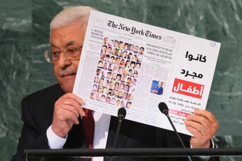 Der palästinensische Präsident Mahmoud Abbas hält ein Foto hoch, während er auf der 77. Sitzung der UN-Generalversammlung am 23. September 2022 in New York City spricht.