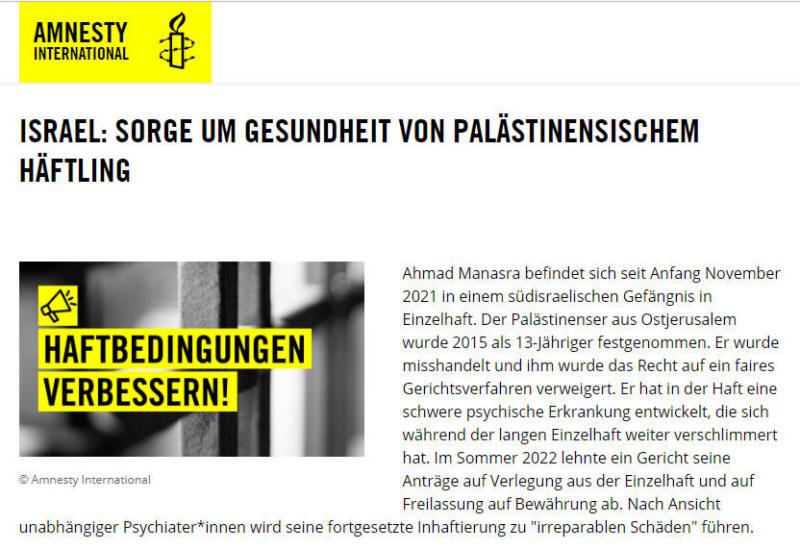 Am 1. September 2022 lehnte das israelische Bezirksgericht Be'er Sheva einen Antrag auf Aufhebung der Einstufung des palästinensischen Gefangenen Ahmad Manasra als "Terrorist" ab, obwohl er im Alter von 13 Jahren auf brutale Weise festgenommen, ohne Beisein eines Erwachsenen oder Anwalts gewaltsam verhört und anschließend inhaftiert wurde, obwohl er keine Straftat begangen hatte. Die Einstufung Manasras als "Terrorist" bedeutet, dass sein Verteidigungsteam keine vorzeitige Entlassung beantragen kann, da er bereits zwei Drittel seiner Haftzeit hinter sich hat, so der Palästinensische Gefangenenclub.