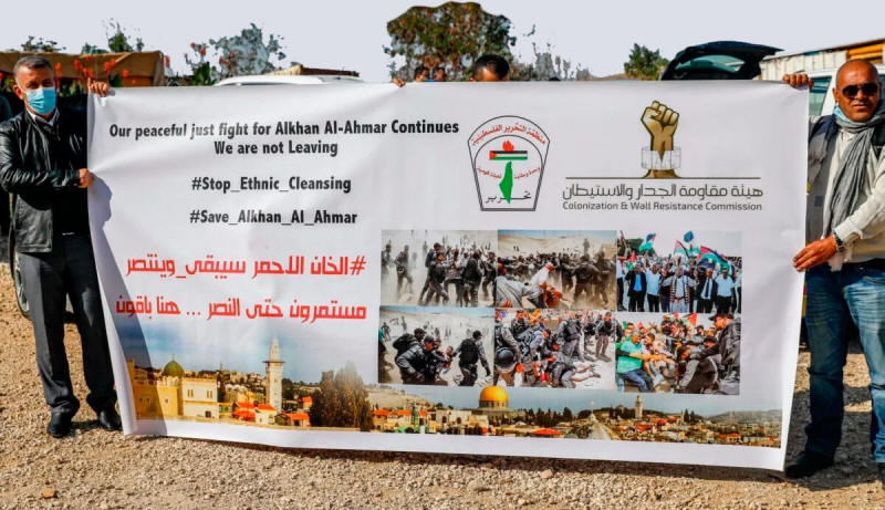 Seit 2009 hat der Besatzungsstaat die Erlaubnis erhalten, die Häuser der Bewohner von Khan Al-Ahmar abzureißen, um Platz für rein jüdische Siedlungen zu schaffen. Seitdem droht ihnen die Zwangsräumung.
