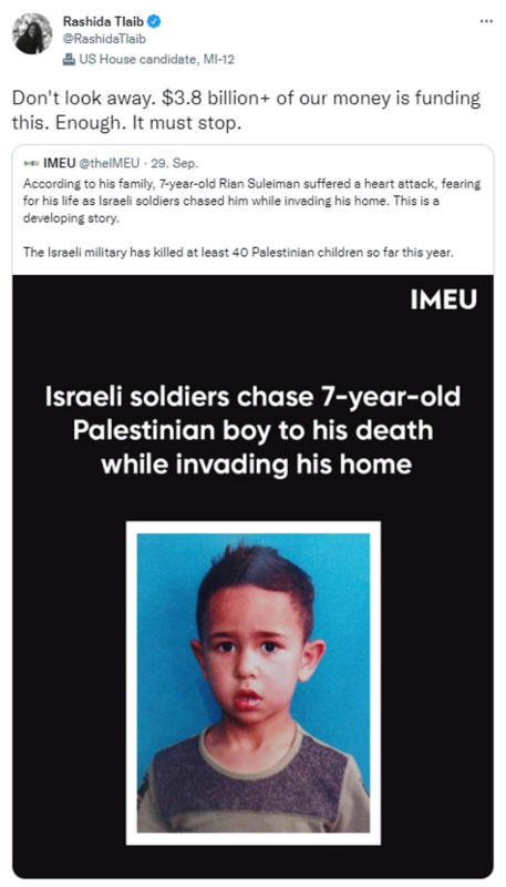 Die Ungeheuerlichkeit dieses Mordes hätte in diesen Tagen der Ehrfurcht zwischen Rosch Haschana und Jom Kippur die Empörung führender jüdischer Institutionen in den USA hervorrufen müssen. Nein. Liberale Zionisten rieben sich die Hände über den Mord, während die einzige angemessene Reaktion von den Ketzern Jewish Voice for Peace und IfNotNow kam, die Rashida Tlaibs wütende Erklärung retweeteten.