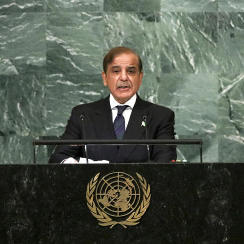Der pakistanische Premierminister Shehbaz Sharif spricht während einer Sitzung der Generalversammlung der Vereinten Nationen im UN-Hauptquartier in New York am 23. September 2022.