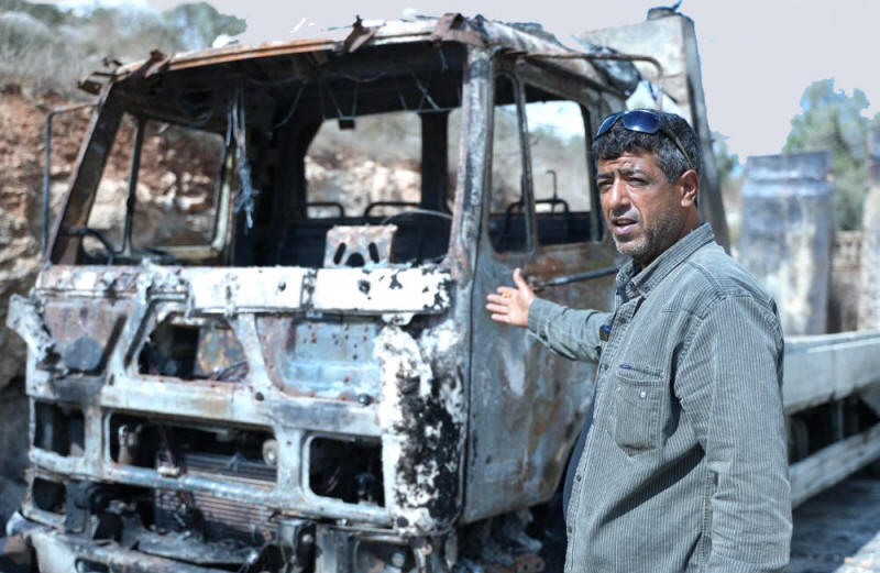 "Die Siedler zogen sich zurück, aber als sie die Soldaten sahen, kamen sie mit voller Wucht zurück und begannen, näher zu kommen, wobei sie alles zerstörten, was sich ihnen in den Weg stellte", sagte er. "Die Soldaten haben sie nicht zurückgedrängt. Stattdessen begannen sie, uns anzugreifen und auf uns zu schießen".Die von Middle East Eye ausgewerteten Aufnahmen von Odehs Überwachungskameras bestätigen seine Geschichte. "Während die Soldaten uns zurückdrängten und angriffen, fingen die Siedler an, einen unserer Lieferwagen, der weiter oben auf dem Hügel geparkt war, in Brand zu setzen, während eine andere Gruppe von ihnen kam und begann, einen unserer Lastwagen in Brand zu setzen. "Das alles geschah vor den Augen der Soldaten", sagte er und fügte hinzu, dass die Soldaten ihn und seine Mitarbeiter daran hinderten, das Feuer zu löschen, das die Lastwagen und die Olivenbäume verschlungen hatte.