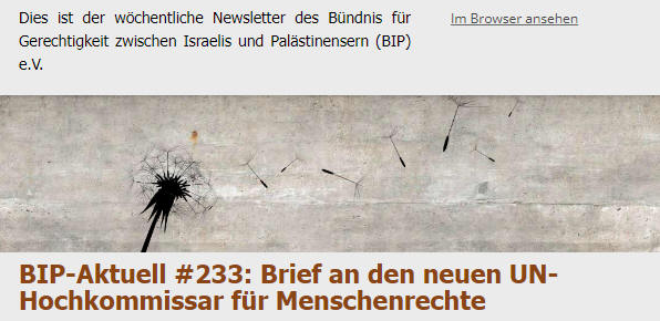 Die größte palästinensische Menschenrechtsorganisation, Al-Haq, hat diesen Brief an den neuen Hochkommissar für Menschenrechte bei den Vereinten Nationen, VolkerTürk, geschrieben und am 17. Oktober abgeschickt. Der Brief wurde von allen Mitgliedern des ECCP (European Coordination of Committees for Palestine), einem Netzwerk von 43 Organisationen aus 18 europäischen Staaten, darunter auch BIP, sowie von vielen anderen Gruppen aus der ganzen Welt mitunterzeichnet. Der Brief befasst sich mit der eskalierenden Gewalt im Westjordanland (siehe BIP-Aktuell #322), dem Angriff auf palästinensische zivilgesellschaftliche Organisationen, darunter auch Al-Haq selbst durch das israelische Verteidigungsministerium (siehe BIP-Aktuell #222), und den katastrophalen Bedingungen im belagerten Gazastreifen (siehe BIP-Aktuell #152). mehr >>>