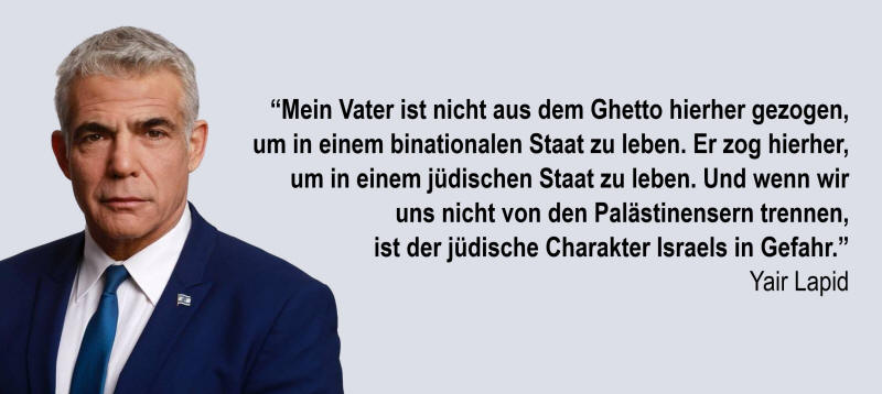 Lapid hat den Widerspruch zwischen einem jüdischen und einem demokratischen Staat offen eingeräumt, dennoch hält er unbeirrt am jüdischen Staat fest, denn, wie er 2015 schrieb: "Mein Vater ist nicht aus dem Ghetto hierher gezogen, um in einem binationalen Staat zu leben. Er zog hierher, um in einem jüdischen Staat zu leben. Und wenn wir uns nicht von den Palästinensern trennen, ist der jüdische Charakter Israels in Gefahr." Die letzte Zeile erinnert besonders an das Problem mit Lapids zionistischer Ideologie.