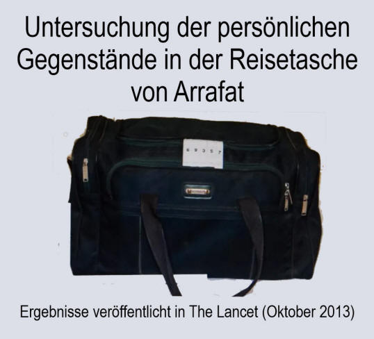 Ein Gepäckstück, das Jassir Arafat gehörte, wird auf einer Pressekonferenz am 7. November 2013 in Lausanne gezeigt, nachdem Schweizer Wissenschaftler zu dem Schluss gekommen sind, dass Palästinenserführer Jassir Arafat wahrscheinlich an einer Poloniumvergiftung gestorben ist